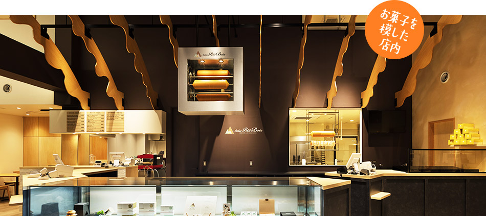 その森の中に人々が集い、自然とふれあい、大地の恵みを感じながらお菓子を愉しむ憩いの場を作りたいという想いからAtelier Petit Boisが誕生しました。 本物だからこそ伝えたいこと、見て味わってもらいたいこと、Atelier Petit Boisでは美味しさが生まれる瞬間を直接お客様に感じていただきたいという想いもあり、職人がバウムクーヘンやクッキーを焼いているところを実際に見ていただけるアトリエにしました。